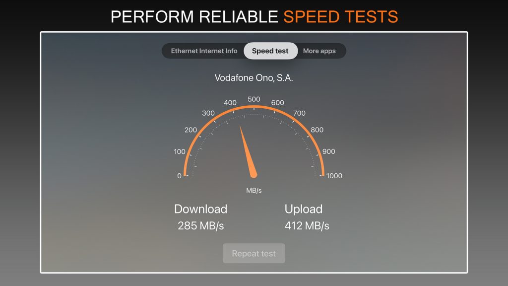 Ethernet Info es la app mas útil de la AppleTV Store para consultar toda la información sobre tu actual conexión a Internet por ethernet, velocidad y mucho mas.